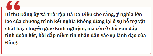 Bí thư Đảng ủy xã Trà Tập Hà Ra Diêu cho rằng, ý nghĩa lớn lao của chương trình kết nghĩa không dừng lại ở sự hỗ trợ vật chất hay chuyển giao kinh nghiệm, mà còn ở chỗ vun đắp tình đoàn kết, bồi đắp niềm tin nhân dân vào sự lãnh đạo của Đảng. Từ công tác xây dựng Đảng, đào tạo cán bộ, đến cải cách hành chính, chuyển đổi số; từ giáo dục, y tế, an sinh xã hội cho tới quảng bá văn hóa, phát triển du lịch, gìn giữ môi trường… mọi nội dung kết nghĩa đều thể hiện tầm nhìn toàn diện, lâu dài.