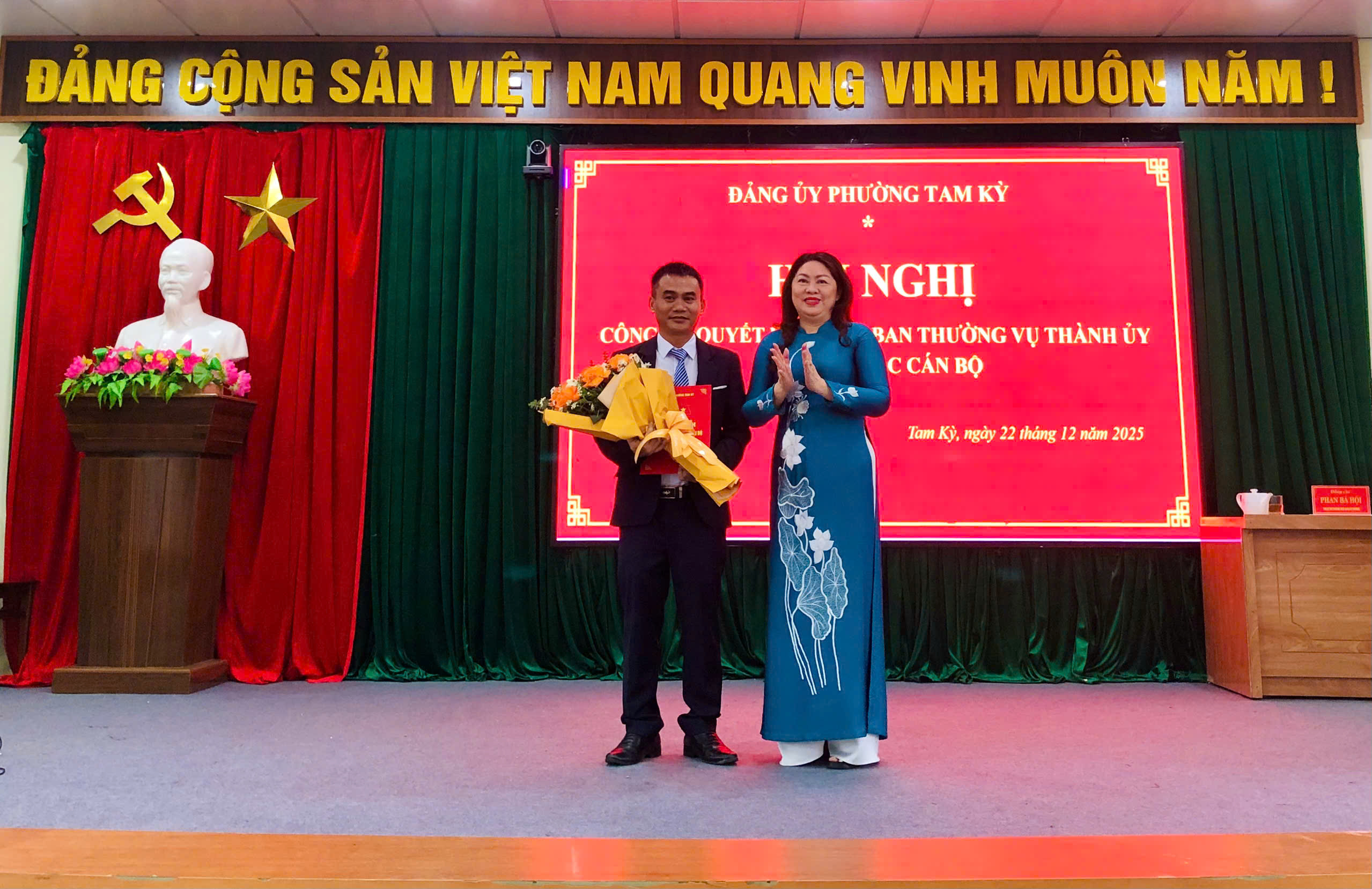 Đồng chí Nguyễn Thị Thu Lan - UVBTV Thành ủy, Bí thư Đảng ủy, Chủ tịch HĐND phường trao quyết định và hoa chúc mừng cho đồng chí Huỳnh Bảo Quốc
